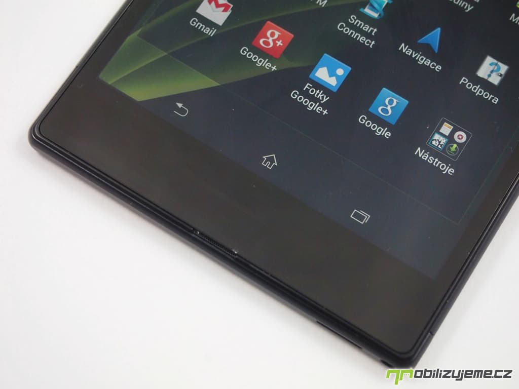 Vrátíme se ale nohama na zem a podíváme se, co všechno na Xperii Z Ultra najdeme. Na přední straně je to kromě přerostlého dotykového displeje v horní části 2 Mpx kamerka pro videohovory a vlastní autoportréty, dále logo Sony, reproduktor pro hovory, senzor vzdálenosti a senzor jasu a nechybí zde ani indikační LED dioda, která bílé signalizuje nové notifikace, oranžově nabíjení a zeleně pak plně nabitý stav. Pod displejem pak spatříme jen mikrofon, klávesy jsou totiž přímo součástí systému a tedy objevují se v dolní části dotykového displeje.