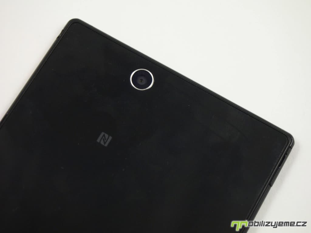 Co říct k zadní straně? Jednoduchost par excellence. Kromě fotoaparátu a pár známek a log výrobce zde nic dalšího neobjevíme. Fotoaparát postrádá LED blesk, celá zadní strana je pak dokonale rovinná. Uživatele bude ještě zajímat logo pro NFC, které ukazuje umístění této technologie v horní části tabletofonu, jak jsme se ale přesvědčili, anténa NFC je zabudovaná i na dalších přilehlých místech kolem horní části zadní strany.