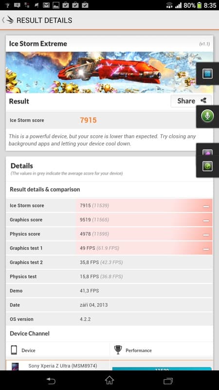 Posledním, třetím testem, je 3D Mark coby letitá klasika z PC scény, která prověřuje grafický výkon zařízení. Výsledek v rámci testu Ice Storm, který je jako jediný přístupný i na ARM procesory, je přímo porovnatelný s výsledkem, který vám dá váš stolní počítač a notebook. Zkuste si tedy tento test na svém počítači a zjistíte, o kolik že je vlastně v této recenzi testované zařízení, případně váš mobil, méně či více výkonný než klasické PC, které vlastníte. Testy provádíme v obou možnostech testu. Ice Storm renderuje veškerou grafiku v rozlišení 1280×720, používá normální kvalitu textur a normální post-processing. Extreme verze renderuje grafiku v rozlišení 1920×1080, textury používá ve vysokém rozlišení a taktéž je zde použité vysoké nastavení post-processingu.