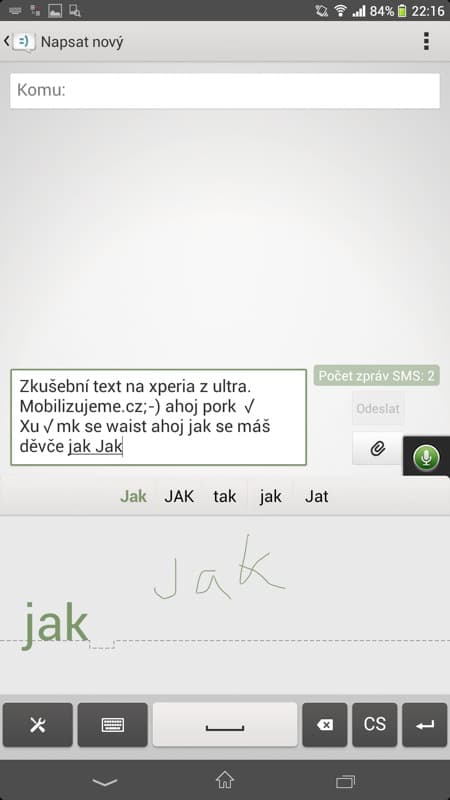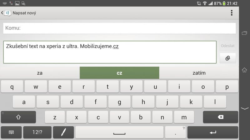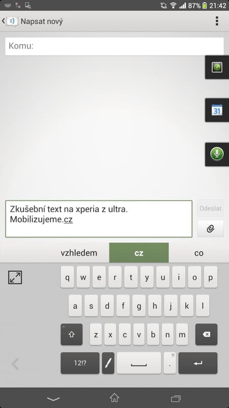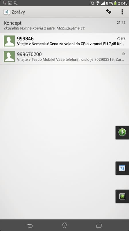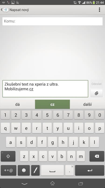 V nastavení je navíc možné si klávesnice a jejich rozvržení doupravit včetně grafického stylu. Osobně jsem si k plnohodnotné klávesnici přidal další řádek napevno s čísly, odkaz na smajlíky a místo světlého provedení začal používat tmavé černé provedení, které lépe koresponduje s testovanou černou verzí Xperie Z Ultra. Ale každý si vše může nastavit dle svého gusta. Samotné zprávy se jinak nesou v duchu klasického Androidu, tedy vše je vedeno v konverzacích s jednotlivými kontakty, nechybí odpočítávání počtu znaků u posledních 20 znaků do právě psané zprávy ani zasílání doručenek při potvrzení odeslané zprávy.