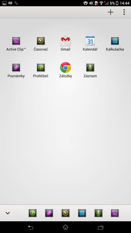 Na jednotlivé plochy Xperie Z Ultra (může jich být max. 7) se dá umístit celá řada zástupců aplikací a widgetů. Ve spodní liště vždy zůstává šestice věrných aplikací, které jsou k dispozici z každé plochy, prostřední sedmou ikonkou pak přejdeme do menu aplikací. V něm jsou aplikace zobrazeny v matici 5×6 ikon a můžeme si je pro větší přehlednost různě řadit a třídit do složek. Takže zatím nic, co by neznali někteří uživatelé Androidu.