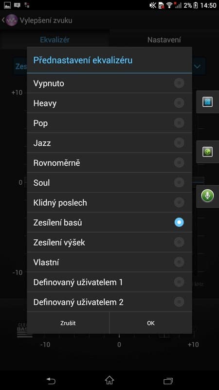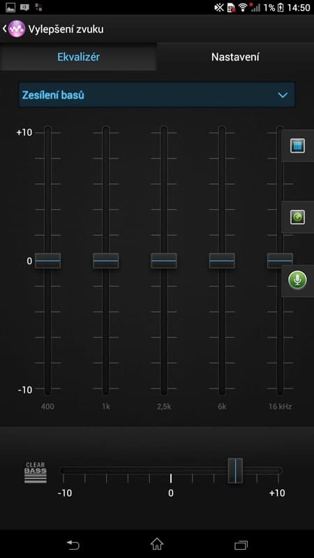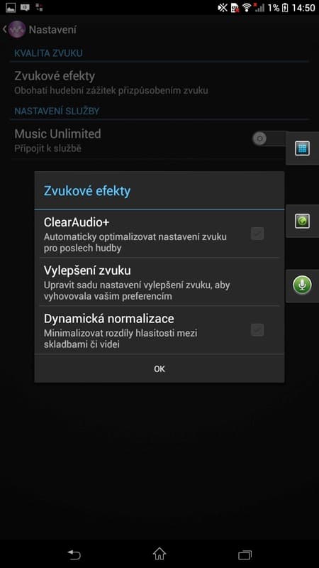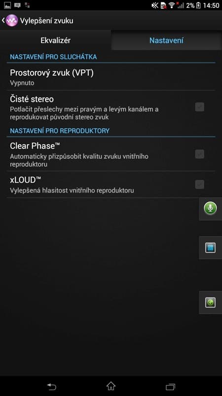 V nastavení zvuku ještě najdeme možnosti pro sluchátka – nastavení prostorového zvuku (studio, klub, koncertní sál) a čisté stereo (potlačí přeslechy mezi pravým a levým kanálem), a možnosti pro reproduktory – Clear Phase (automaticky přizpůsobí kvalitu zvuku vnitřního reproduktoru) a xLoud (vylepší hlasitost reproduktoru). Jak která funkce prakticky funguje? Chce to vyzkoušet na poslouchané hudbě.
