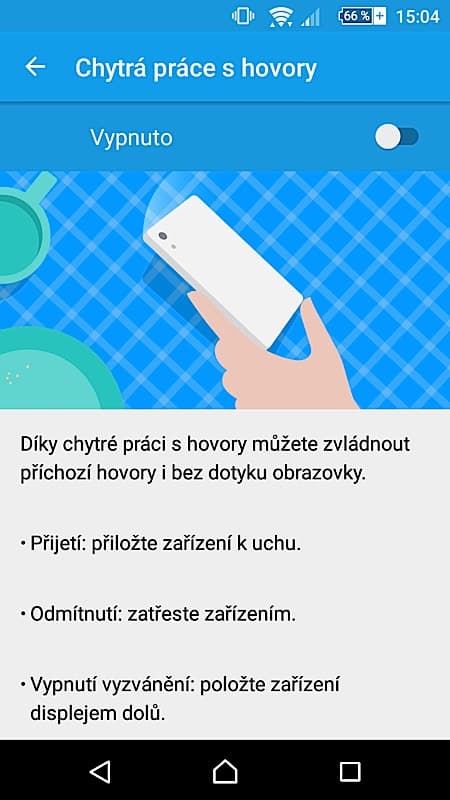 Z dalších možností u Sony nezapomněli ani na pohybové funkce, například přiložením telefonu k uchu zvednete hovor, zatřesením telefonu hovor naopak odmítnete, či položením zařízení displejem dolů vypnete vyzvánění. Šikovná je také funkce, která zajistí nezhasnutí displeje, dokud telefon držíte v ruce (aniž byste se dotkli obrazovky). A přínosná je i notifikace pomocí barevné LED diody umístěné v pravém horním rohu nad displejem.