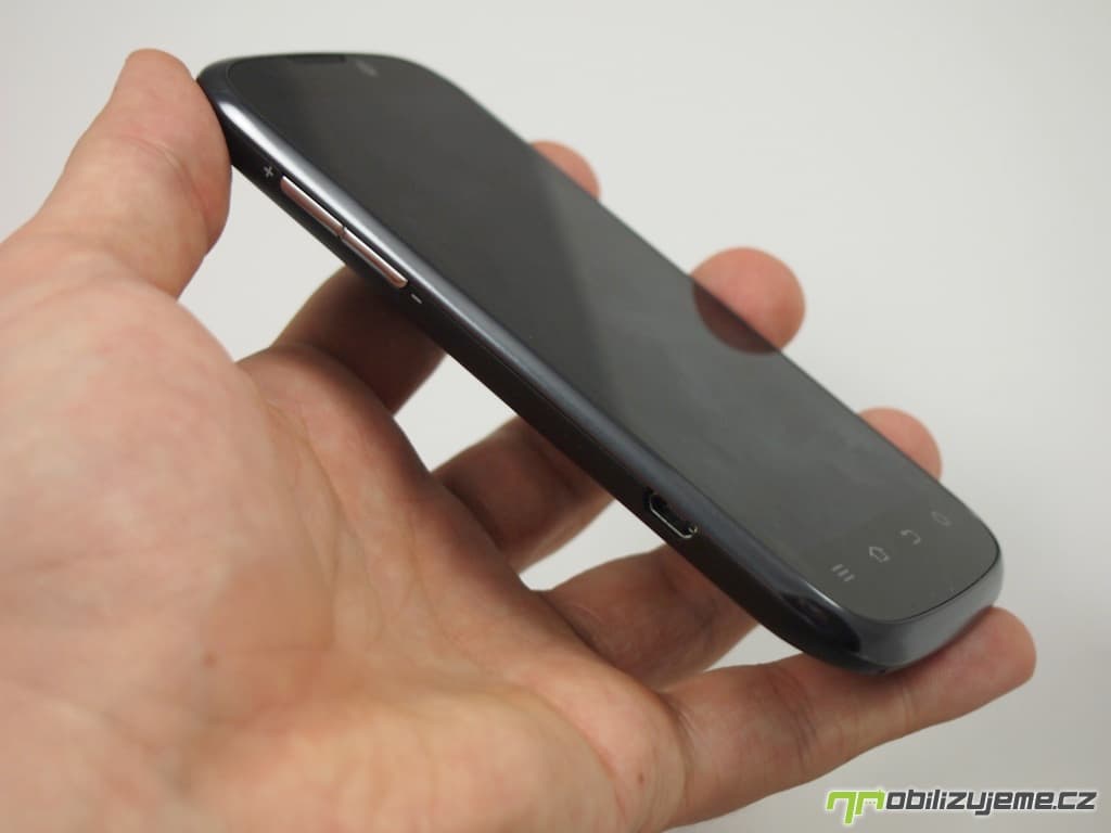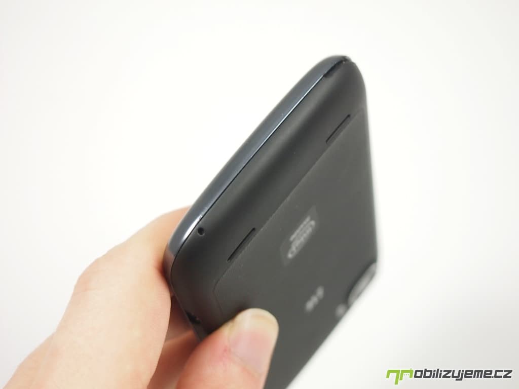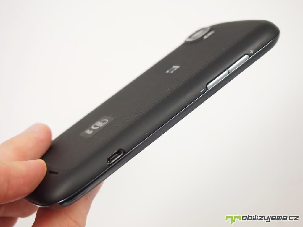 Pokud se podíváte na pravý bok telefonu, nic nenajdete. Zmínit mohu jen v dolní oblé hraně trošku useknutý kryt, který slouží jako takové otvírátko, kterým tento kryt sejmete. I tak je to ale docela málo, protože kryt na telefonu drží opravdu pevně a je připnut na několika záplatách. Nic ke zkoumání není ani na dolním boku, a proto bych se přesunul na bok levý, protože zde již máme slot pro microUSB port, který slouží jednak k propojení smartphonu s PC a samozřejmě také jako slot pro nabíječku. V horní části jsou umístěna dvě tlačítka pro regulaci hlasitosti. Na černé barvě telefonu se tato stříbrná pochromovaná barva perfektně vyjímá, a myslím, že i umístění je zvoleno vhodně. Mačkají se bez problémů, avšak pokud na ně šáhneme a zkusíme s nimi „zamávat“ ze strany na stranu, tak zjistíme, že nejsou nějak extrémně pevná. Docela se viklají, což může do budoucna způsobit potencionální závadu.