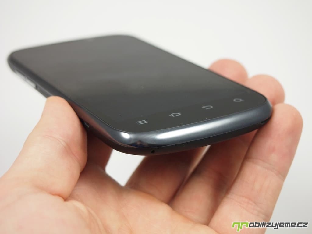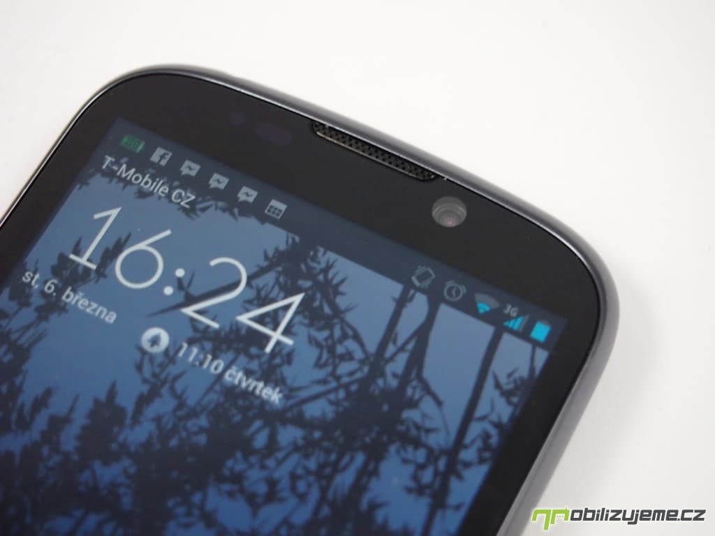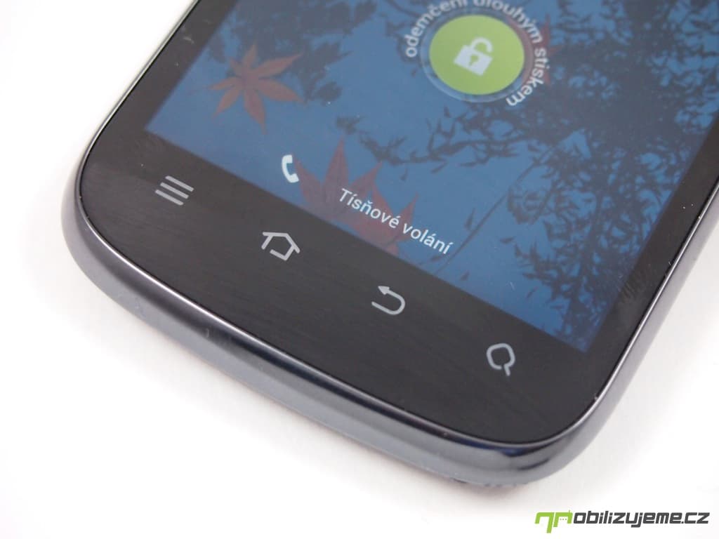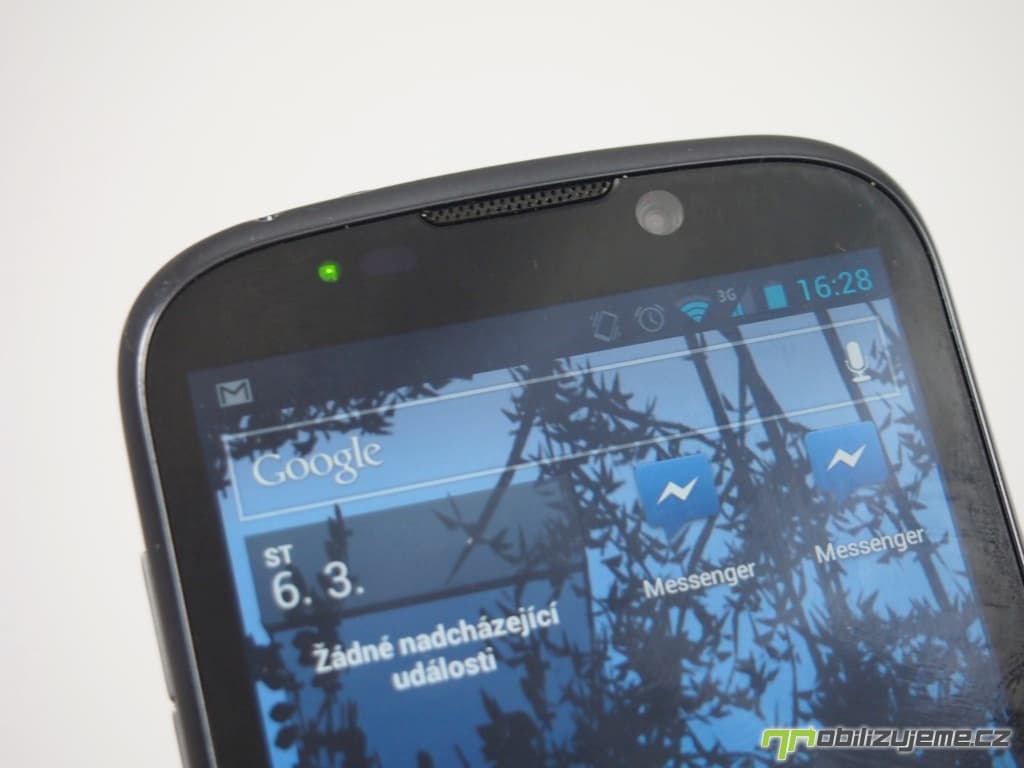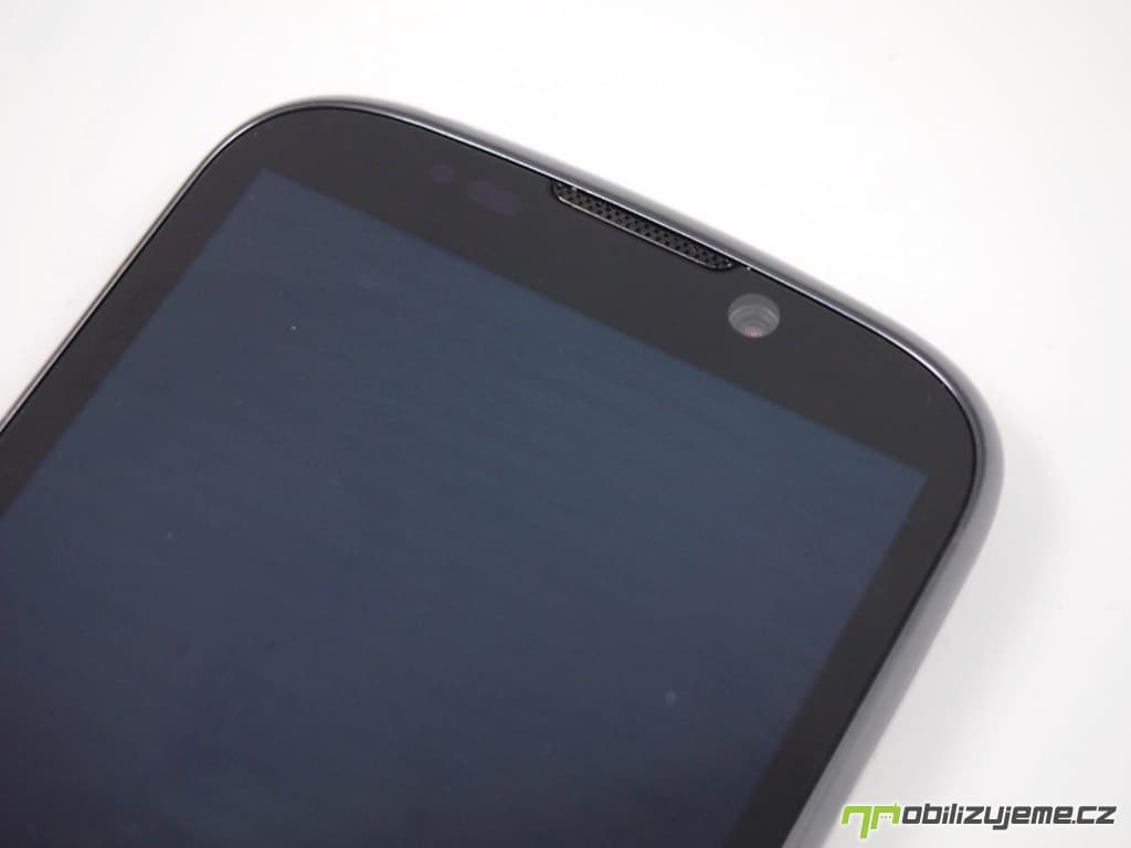 Čelní strana je pokryta z 90% displejem. Pod ním jsou 4 senzorová tlačítka, která jsou typickým znakem Androidu. Jedná se tedy o tlačítko možností, domů, zpět a lupu. Pod nimi již nic není, takže bych se zaměřil na prostor nad displejem, který je vyplněn samozřejmě mikrofonem pro telefonování. Vedle něj je ještě přední kamerka, která slouží pro videohovory. Vlevo od mikrofonu je pak dioda pro regulaci jasu a notifikační dioda, která bliká zeleně na náznak zmeškané události. Dioda pro regulaci jasu nefunguje zcela bez chybek, občas jí trošku trvá, než si sedne s prostředím, takže komu tato možnost nebude vonět, může si pochopitelně jas volit a regulovat ručně.