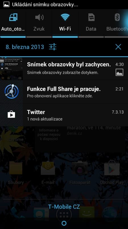 Poslední věcí, na kterou nesmím zapomenout, je horní výsuvná lišta, která je také většině z vás známá. Spustíme ji slidem prstu z vršku displeje. Snadno se z ní přesunete do nastavení, stejně tak zapnete, popřípadě vypnete některé funkce, jako je například Bluetooth, Wi-Fi, automatické otočení, nastavení jasu a další. Slouží to tedy pro usnadnění práce. V této liště se vám také zobrazují zmeškané události, všechna oznámení pak křížkem rychle vymažete.