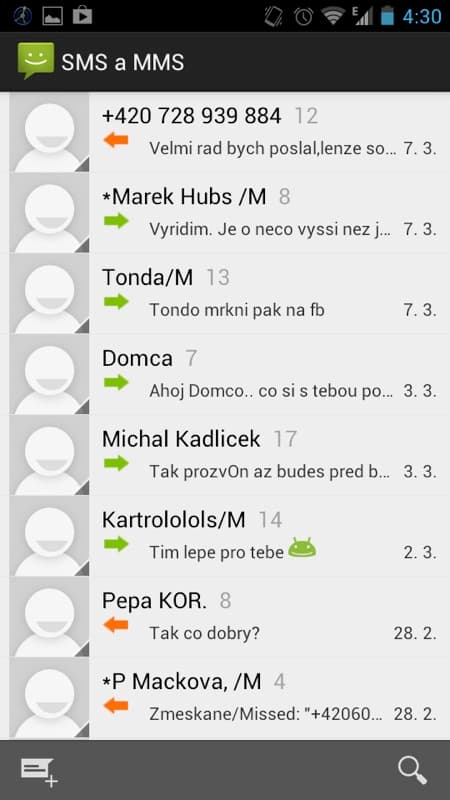 SMS zprávy jsou oddělené chatovacími bublinami. Při psaní SMS máte přehled o počtu znaků a SMS. Psát můžete pomocí klasické klávesnice Android, hlasovým zadáváním, popřípadě TouchPal. Při psaní na šířku jde psaní poměrně dobře, při psaní na výšku už jsem pak často minul písmenko. Určitě to bylo kvůli mým gramlavým rukám, ale myslím, že částečně je na vině také citlivost displeje, o které jsem již ostatně hovořil.