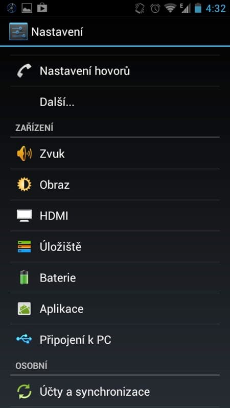Nyní už vám představím hlavní menu, ve kterém opět nenarazíte na žádnou nesrovnalost, kterou by uživatelé Androidu neznali. Bohužel, ikony nejdou uzpůsobit a seřadit podle toho, jak chcete vy. I tak ale musím hodnotit celkovou vyladěnost prostředí jako dobrou. Pohyb je krásně plynulý a rychlý, menší čekání pak nastává až u spouštění aplikací, kde se mi prodleva někdy zdá přeci jen větší, není to však nic hrozného.