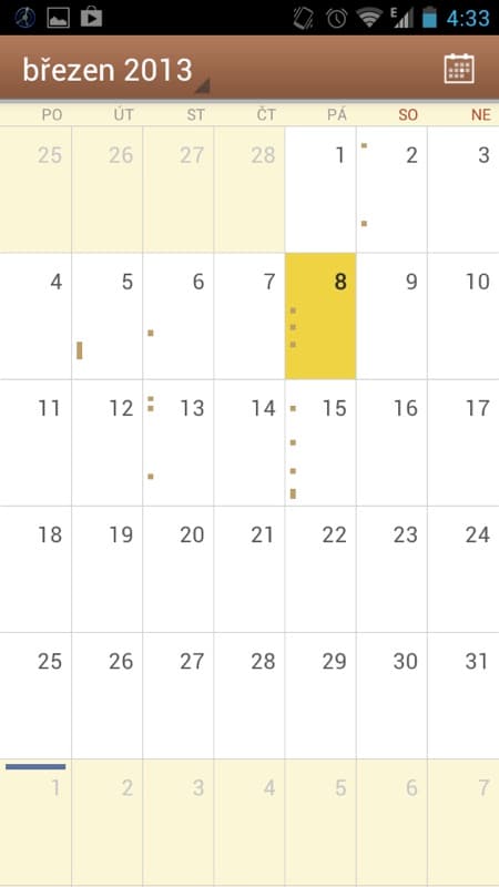 Pro kalendář máme přímo aplikaci, která je docela obyčejná, události se zobrazují v měsíčním, týdenním i denním náhledu, popřípadě jako agenda. V kalendáři se také zobrazují státní svátky a jiné významné události a není problém používat také kalendář z Google.