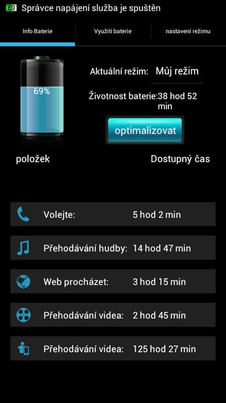 Pomoci s výdrží a k určení optimálního napájecího režimu jistě mnohým pomůže aplikace Správce napájení. Jedná se o velmi přehledného průvodce nastavením a optimalizováním využívání aplikací a samotné baterie. Můžete si zvolit z již představených režimů, nebo si jednoduše nastavit svůj vlastní. Aplikace obsahuje také celkové informace o využívání baterie.
