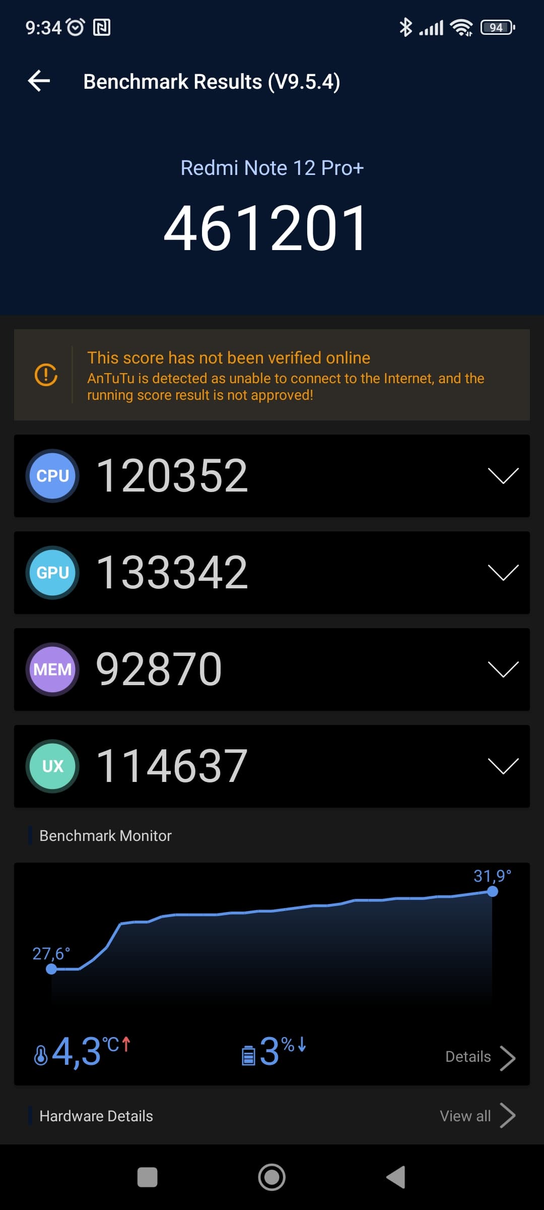Při běžném používání procesor hřeje jen opravdu minimálně a více tepla začne produkovat až při delším hraní. A ani v tomto případě není zahřívání nijak extrémní, což dokazuje i zátěžový test 3DMark, který čipset, respektive telefon, dokončil s výbornou stabilitou 99,2 %. Co se dalšího hardwaru týče, tak Redmi Note 12 Pro+ má 8 GB RAM (+ 3 GB formou virtuálního rozšíření), vnitřní úložiště o velikosti 256 GB (UFS 2.2) bez možnosti rozšíření a komplexní konektivitu – 5G, WiFi 6, USB-C, Bluetooth 5.2, 3,5mm jack, infračervený port i NFC.