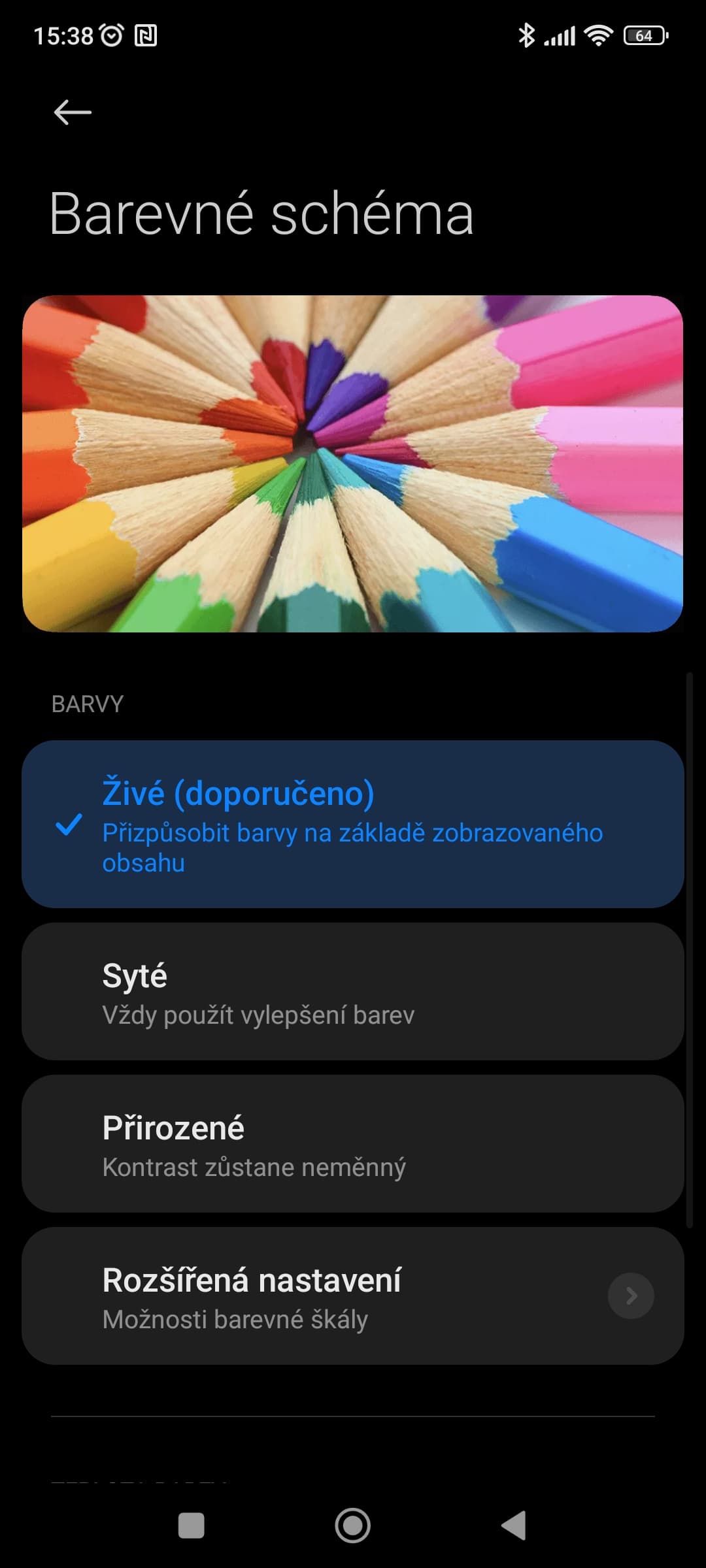 Panel produkuje syté a líbivé barvy, nicméně ne každému to bude po chuti a právě pro tyto uživatele je k dispozici možnost nastavit si je dle sebe. Telefon nabízí tři přednastavené režimy zobrazení barev (Živé, Syté a Přirozené), nicméně k dispozici je i manuální korekce teploty a rozšířené nastavení, které umožní pohrát si s možnostmi barevné škály. Je možní zvolit si P3 nebo sRGB škálu, u které lze navíc upravit barevný prostor v rámci červené, zelené i modré barvy, stejně jako odstín nebo kontrast. Možností nastavení je zkrátka hodně a hraví uživatelé budou spokojeni.