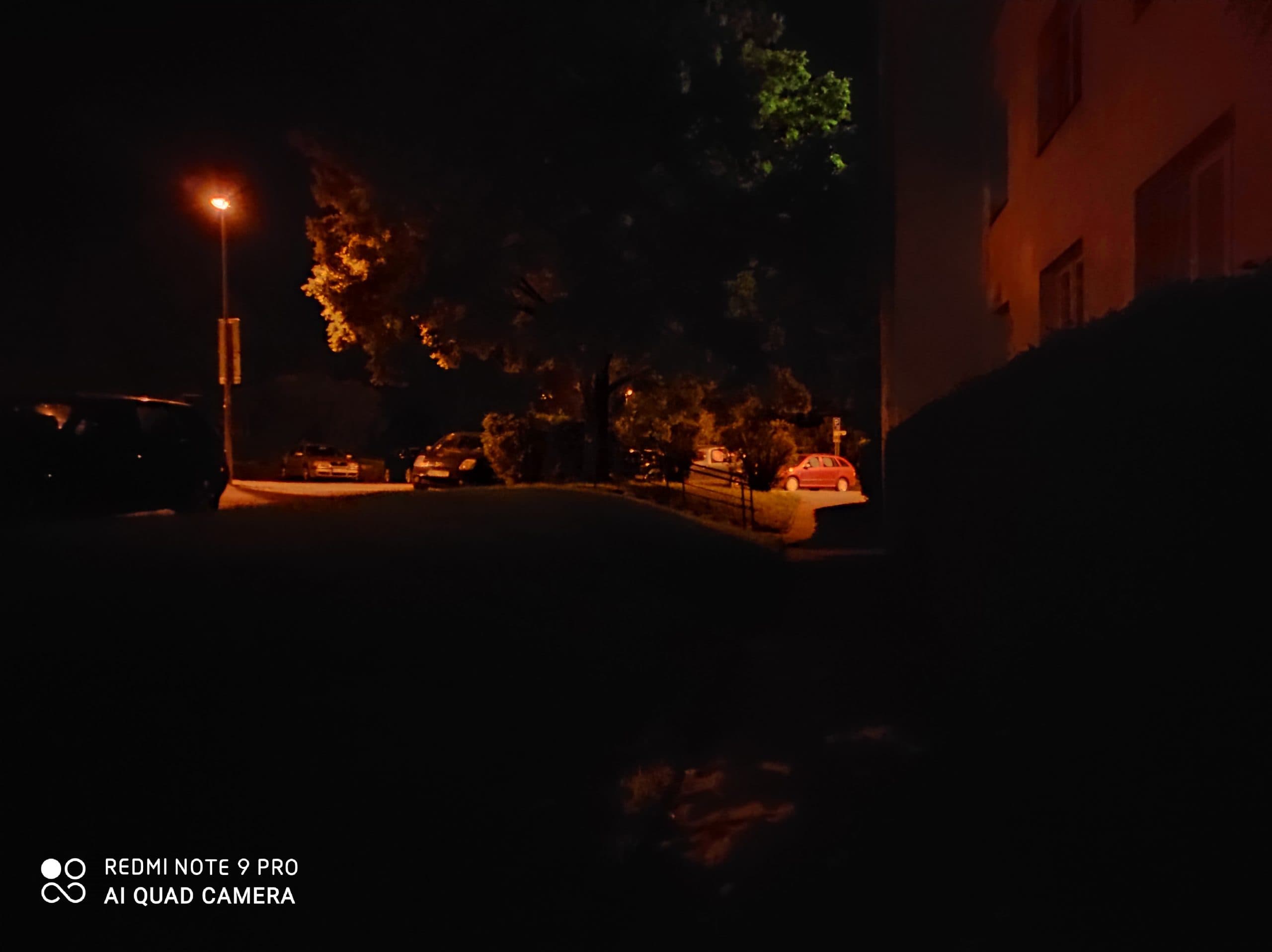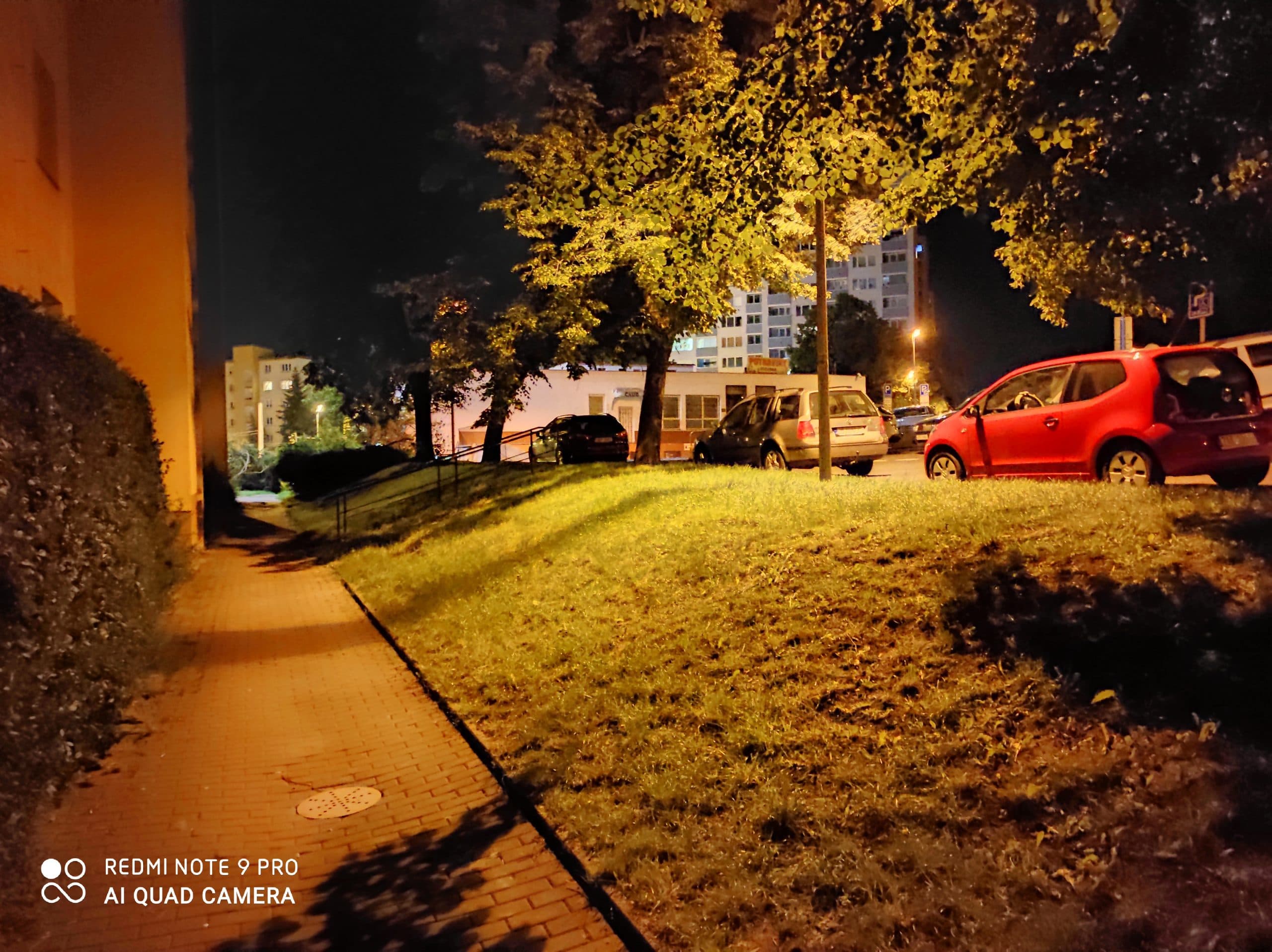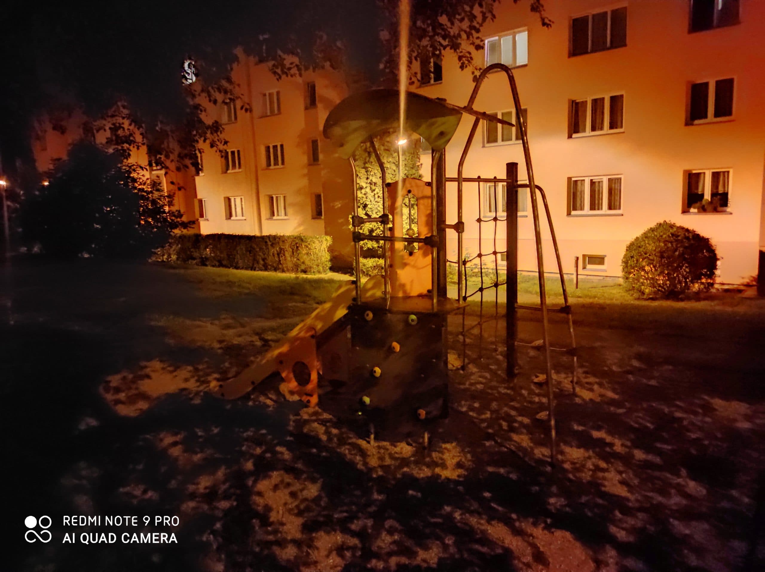 Tak tedy, fotoaparát se večer používat dá, má k tomu samozřejmě dedikovaný noční režim. Uzávěrka je delší, světla mnoho nenachytá (není to Huawei) a snímky bližších objektů (třeba chodník) jsou brutálně rozostřené. Ale jinak to až zase taková nehoráznost není. Třeba u fotky dětské prolézačky mě Redmi příjemně překvapilo, protože tu jsem celou takhle osvětlenou neviděl ani vlastníma očima.