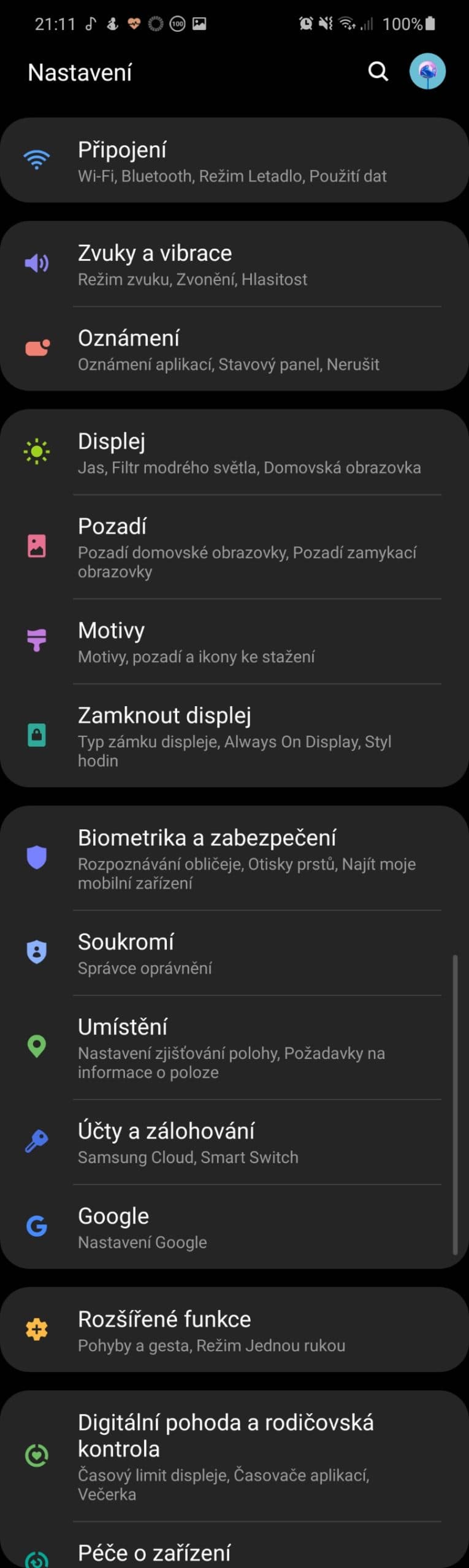 Velký 6,7palcový displej je typu Super AMOLED a má rozlišení 2400 × 1080 pixelů. V základu je aktivovaný režim Živý, který chrlí vysoce syté barvy. Pokud by se vám to nezdálo, můžete podání zkrotit výběrem Přirozený. Barevné podání je stabilní ze všech stran a až na zelenkavé odlesky jsou pozorovací úhly perfektní.