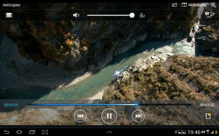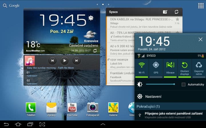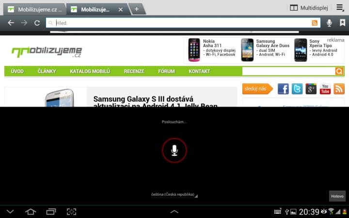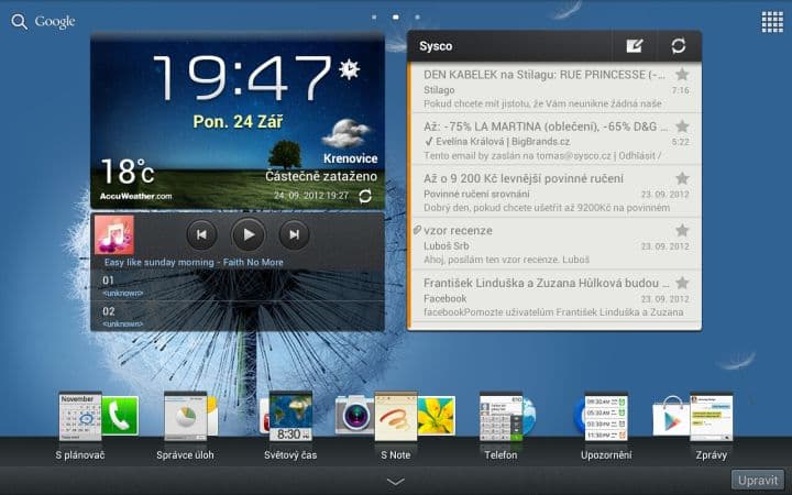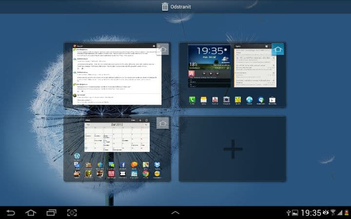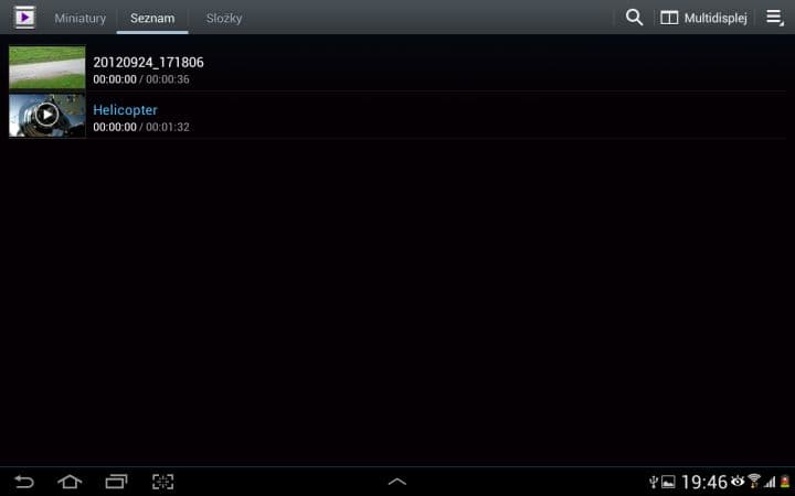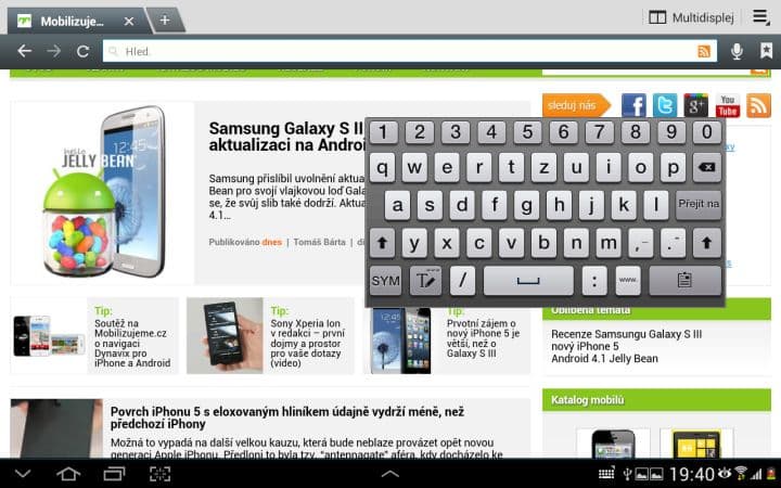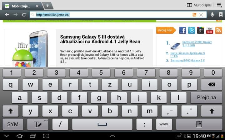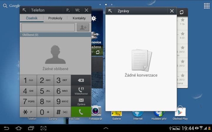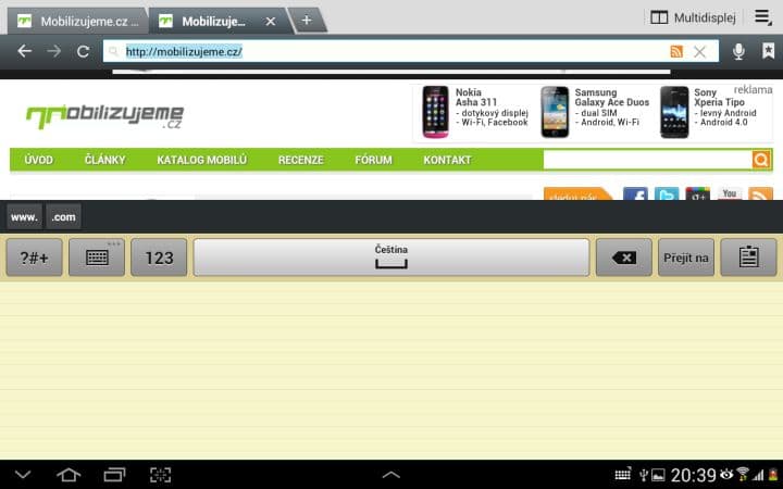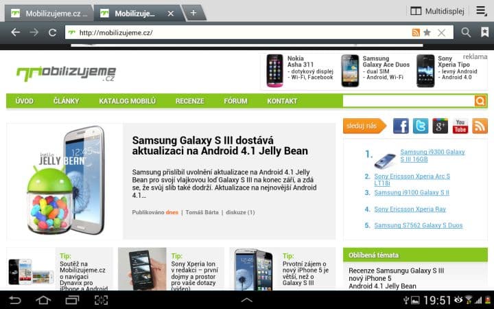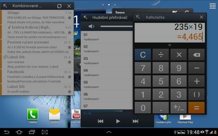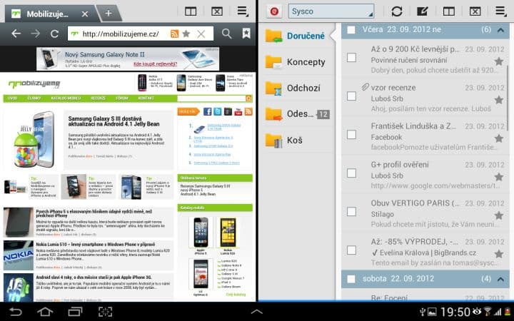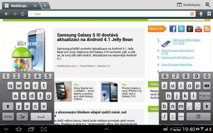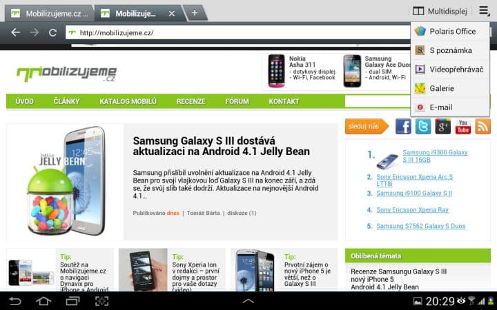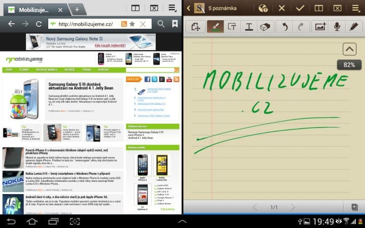 Asi nejzajímavější funkcí je Multidisplej. Pomocí něho můžete rozdělit svou pracovní plochu na dvě části a v každé mít spuštěnou jinou aplikaci. To zní lákavě, ale tato funkce se omezuje pouze na 6 aplikací od Samsungu (internet, polaris office, S poznámka, videopřehrávač, galerie a E-mail). Není možné si tedy spustit třeba Angry Birds a zároveň sledovat film. Dalším neduhem je citelné přepínání mezi aplikacemi. Vždy totiž musíte zhruba sekundu počkat, než můžete například posouvat v prohlížeči. Pak už je všechno plynulé tak, jak má být.