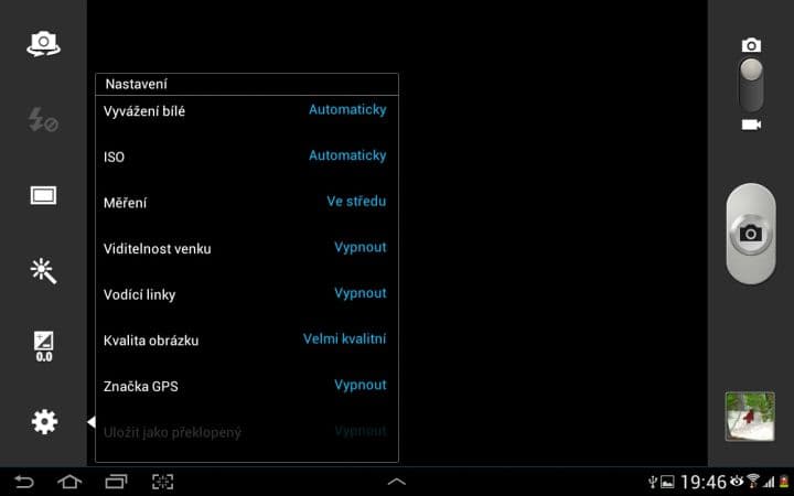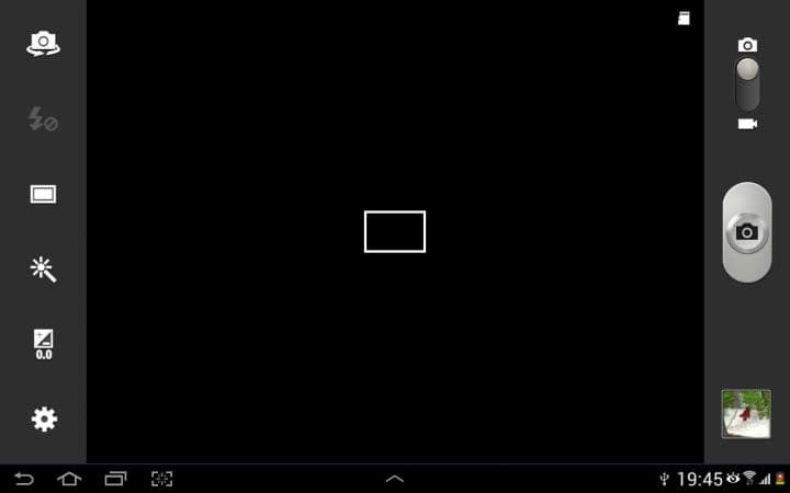 Galaxy Note 10.1 je osazen 5 Mpx fotoaparátem s možností natáčet videa až v rozlišení 720p (30 snímků za sekundu). To je trochu škoda, protože ostatní zvládají i 1080p. Nechybí podpora autofocusu a při horších světelných podmínkách pomůže LED dioda. Prostředí aplikace fotoaparát se dělí na dva sloupce. Ten pravý v sobě ukrývá přepínač mezi nahráváním a fotografováním, spoušť a náhled vyfoceného obrázku. V levém pak najdeme zástupce funkcí, které si můžeme sami změnit.