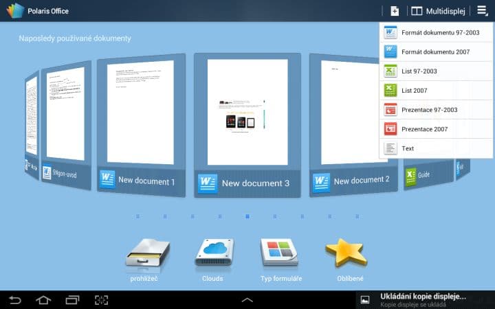 Polaris Office – Kompletní kancelářský office s možností číst a vytvářet formáty .doc, .docx, .xls, .xlsx, .ppt, .pptx a txt. Je propojen také se službami Box.net, Dropbox a Google Drive.