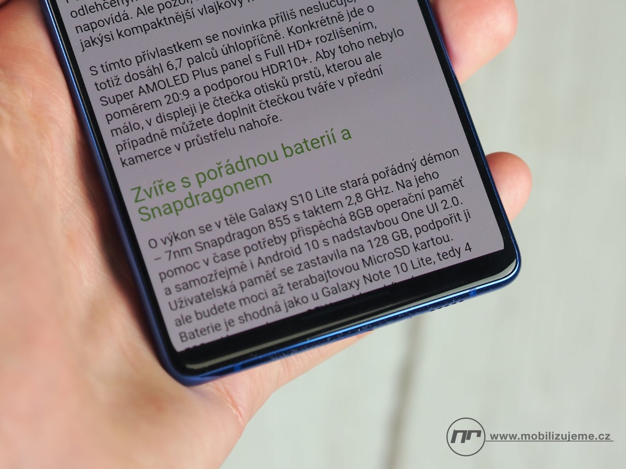 Displej je na čtení či jinou konzumaci obsahu dostatečně velký a ostrý, barvy na něm vypadají vážně úžasně a rozdíl oproti jiným vlajkám nepoznáte. Od dražších kousků se odlišuje snad jen absencí zvýšené obnovovací frekvence nebo zahnutím na stranách. Pokud se ale bez těchto fajnšmekrovin obejdete, displej bude něco, kvůli čemu budete chtít S10 Lite doporučovat.