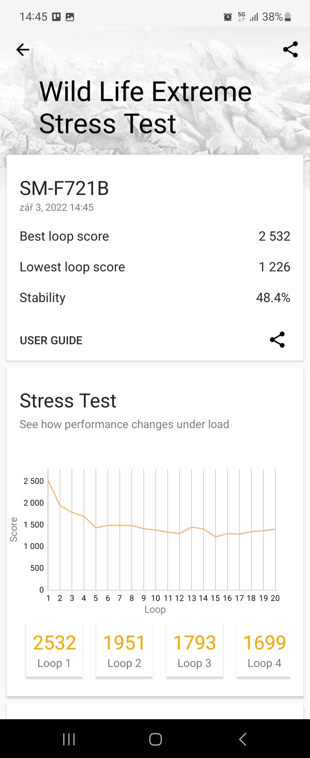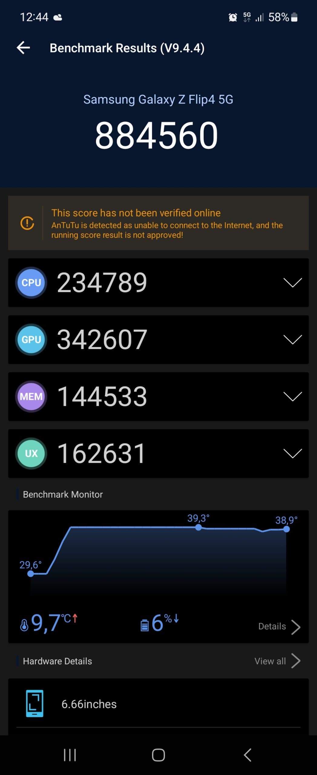 Jak známo, vlajkové čipsety s vysokým výkonem produkují poměrně dost tepla a nejnovější Snapdragon 8+ Gen 1 není výjimkou. Telefon ve vysoké zátěži dost topí a při hraní náročnějších her dosáhne produkce tepla snadno hranice, kdy už je to nepříjemné. Zátěžový test 3DMark pak vykázal stabilitu jen něco málo přes 48 %. Na vyšší produkci tepla a snižování výkonu kvůli přehřívání má podíl také evidentně poddimenzované chlazení a fakt, že v nitru Flipu 4 je méně místa na efektivní rozvádění přebytečného tepla než u telefonů klasické konstrukce.
