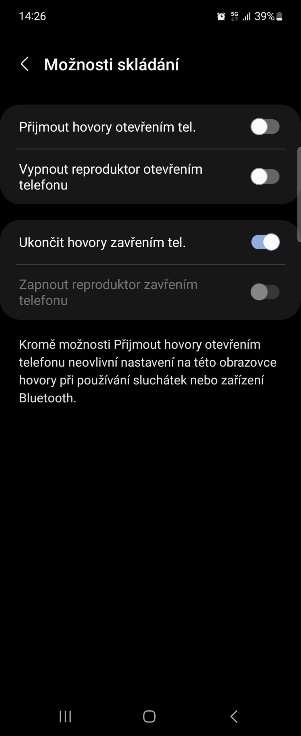 Z ergonomického hlediska mi úplně nevyhovovalo umístění čtečky otisků prstů, která je integrovaná v zapínacím tlačítku. To se nachází až moc vysoko a chvíli mi trvalo než jsem si na to zvykl, nicméně jinde být bohužel nemůže – konstrukce je přesně v polovině, kde by bylo pro čtečku otisků ideální místo, rozpůlená. No a jaké jsou, kromě kompaktní formy v zavřeném stavu, výhody véčkové konstrukce? Je jich hodně a často jsem používal třeba videohovory, kdy je telefon otevřený jen napůl a jeho spodní část slouží jako stojánek, takže ho nemusíte při hovoru držet.