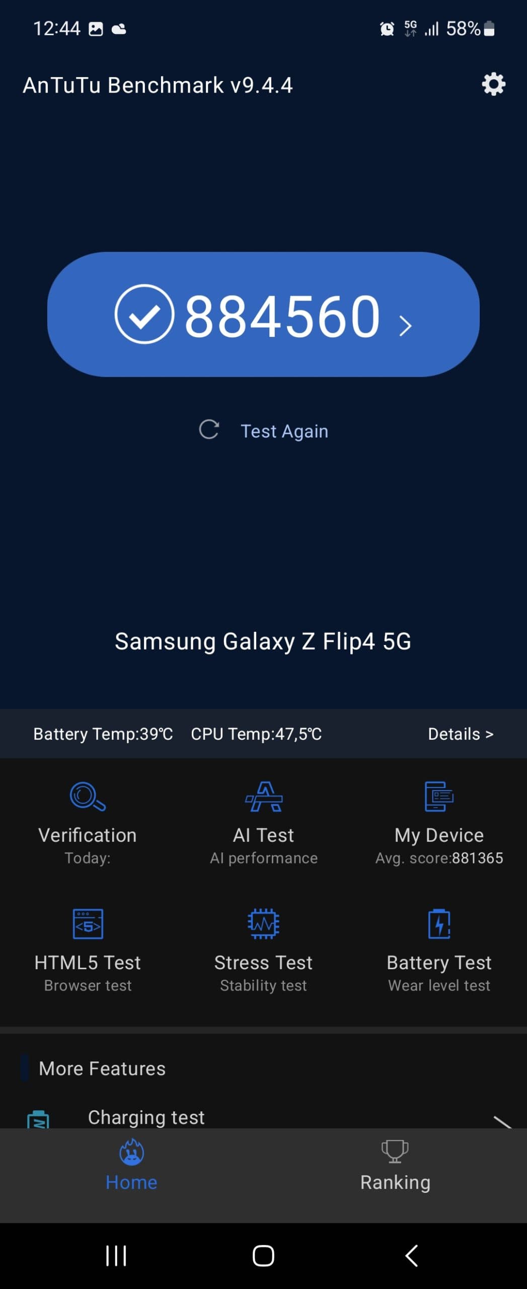 Samsung postavil Flip 4 okolo platformy Qualcomm Snapdragon 8+ Gen 1, což je nejvýkonnější mobilní čipset ve světě Androidu a realita tomu odpovídá. Telefon opravdu překypuje výkonem, vše na něm běží naprosto plynule, bez jakýchkoliv náznaků byť jen sebemenších záškubů, a to platí také pro mobilní hry. Prakticky i ty nejnáročnější tituly si zahrajete na nejvyšší možné detaily a bez jakýchkoliv problémů. A vysoký výkon potvrzují i syntetické benchmarky – například populární AnTuTu ukázalo 884 tisíc bodů a Flip 4 se tak řadí k nejvýkonnějším telefonům dneška.