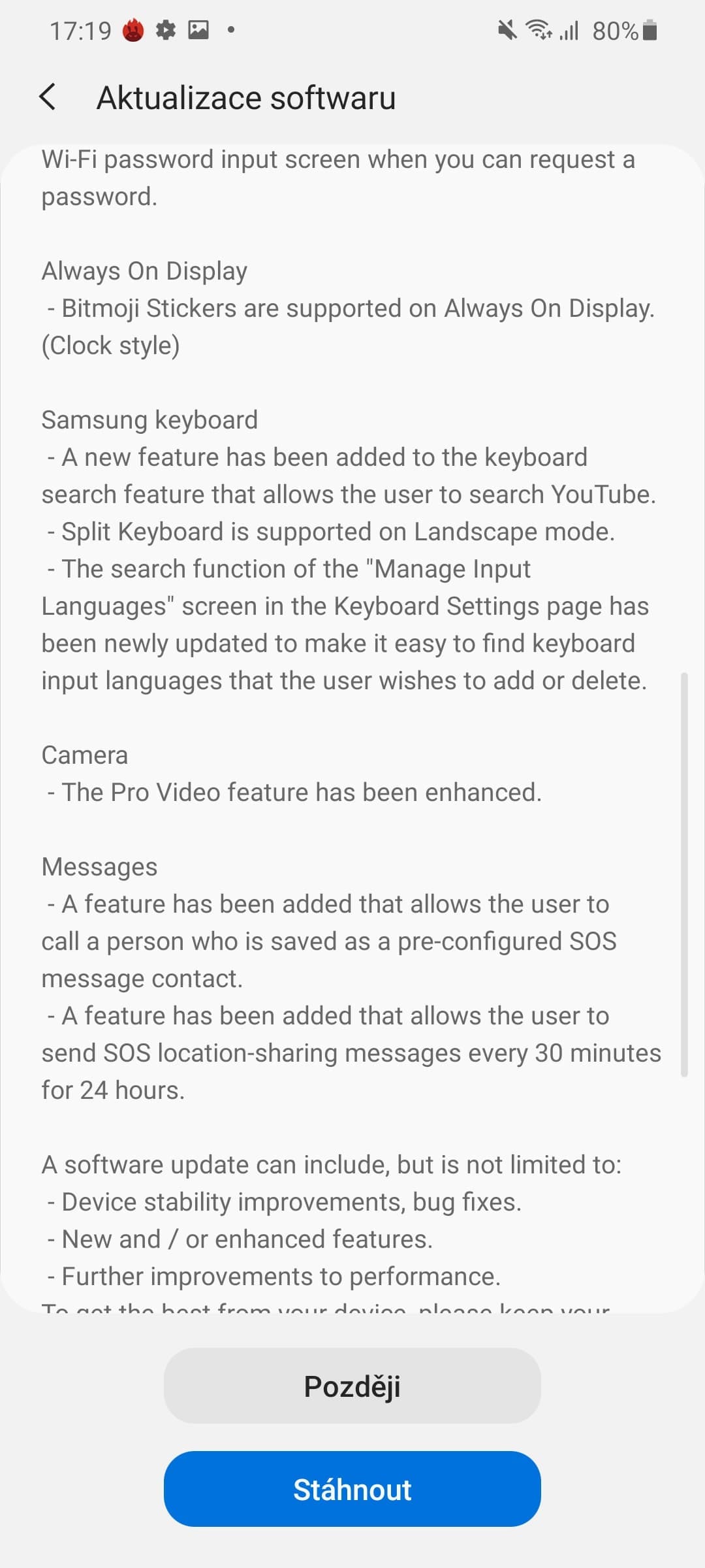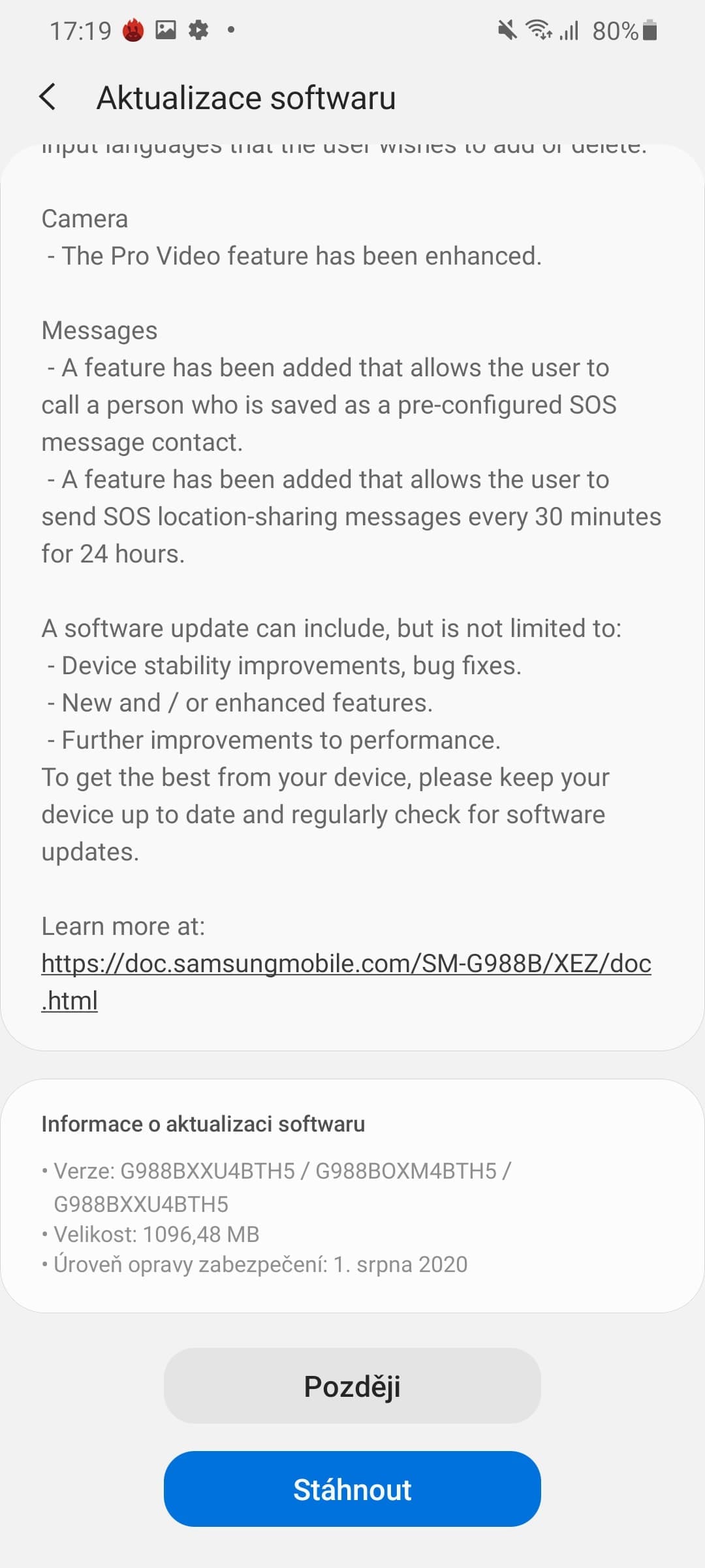 Balíček aktualizací nepřináší pouze vylepšenou nadstavbu One UI 2.5 s mnoha novinkami (podrobně popsáno v changelogu na přiložených screenshotech), ale také srpnovou aktualizaci bezpečnostních záplat. Aktualizace má skoro 1,1 GB a pro její stažení se tak doporučuje použít stabilní Wi-Fi připojení.