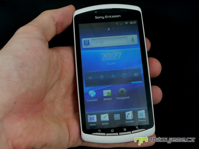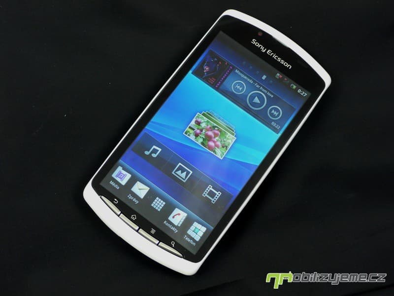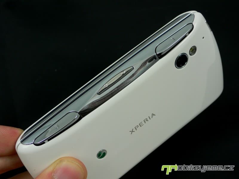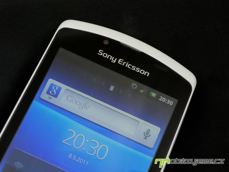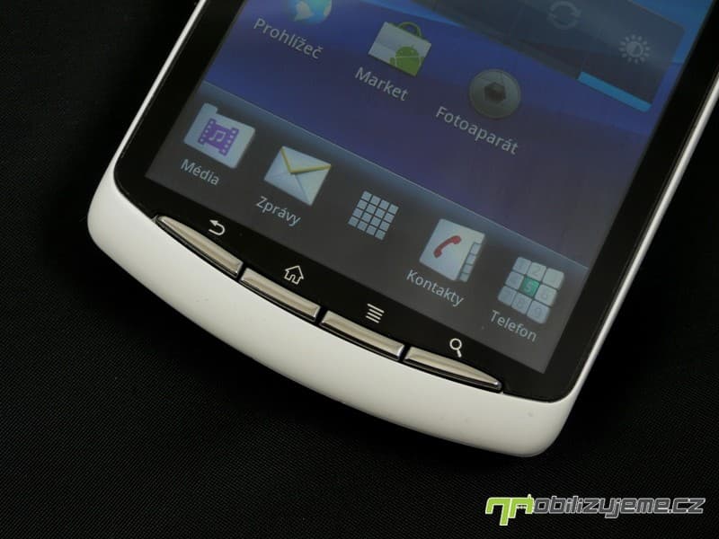 Nyní se pojďme podívat na jednotlivé prvky na telefonu. Přední strana přináší velký dotykový displej, pod kterým najdeme čtveřici Androidích kláves, zleva: zpátečka, domů, nabídka a vyhledat. Oproti starším Sony Ericssonům s Androidem jsou jednotlivé tlačítka na jiných místech, což může způsobit někomu problémy. Během pár dní si však není problém na změnu zvyknout. Osobně se mi nynější rozestavení kláves líbí více, zejména umístění často používané zpátečky úplně vlevo je pro praváky pohodlnější. Kdyby výrobce zcela vypustil klávesu pro vyhledávání, jako u Xperie Neo, byla by v tomto směru absolutní spokojenost.