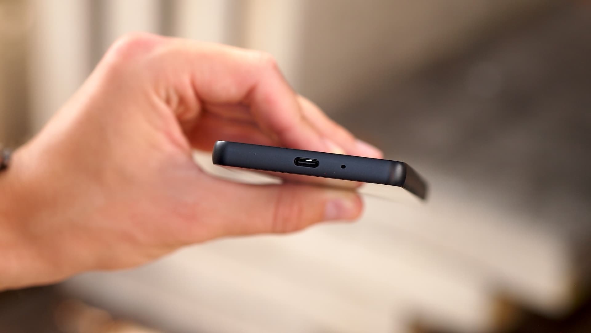 Protější strana lehce zaobleného rámu skrývá šuplík pro SIM kartu. Sony však nepoužívá špendlík pro jeho vytáhnutí, nýbrž volí starší řešení. Šuplík má malé vykrojení a vytáhnete ho za pomocí svého nehtu. Ve spodní části je pouze USB-C konektor a mikrofon. Potěšení se ukrývá na horní straně, kde Sony krom dalšího mikrofonu osadilo i 3,5mm jack pro připojení audio techniky.