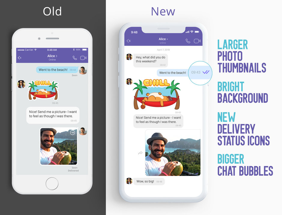 Pastvou pro oči by se měl stát renovovaný design prostředí chatu. Bubliny zpráv budou větší a barevnější, než tomu bylo ve staré verzi Viberu. V lepší kvalitě by měly být i GIF obrázky, fotky a videa, kteréžto prostřednictvím aplikace budete odesílat. Například fotky příjemce obdrží v mnohem větších a kvalitnějších miniaturách na obrazovce chatu.