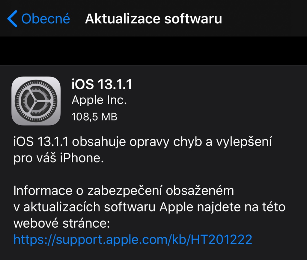 Tentokrát se jedná o menší aktualizaci iOS 13.1.1, která obsahuje opravy jen několika menších chyb a problémů. Instalační balíček má jen něco málo přes 100 MB, přesto doporučujeme stahovat raději přes Wi-Fi síť, abyste si zbytečně nečerpali drahocenná mobilní data.