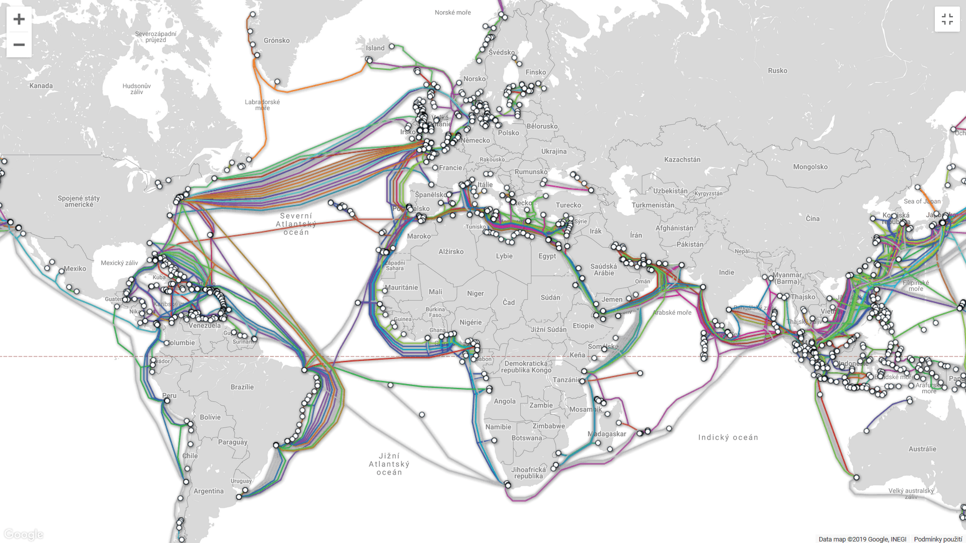 Aktuální mapa kabelů po světě. Zakreslení je přibližné.
