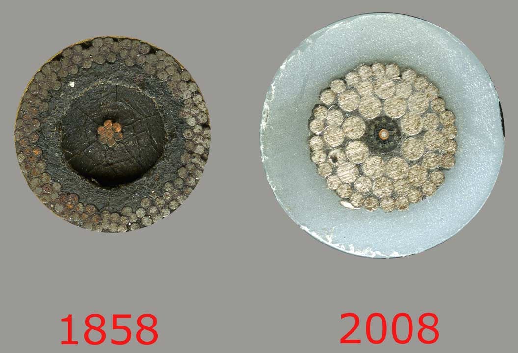 Na vývoji telegrafního kabelu se podílelo mnoho lidí. V roce 1858 přišli s kabelem, tvořeným sedmi měděnými dráty obalenými gutaperčou (hmotou podobnou kaučuku), vázaným konopnými provazy, zalitým asfaltem a chráněným železnými dráty. Vyskytly se dva problémy. Vodič klade procházejícímu proudu odpor, což na obrovských vzdálenostech způsobovalo útlum signálu. Navíc, jak objevil Michael Faraday, pohybující se elektrický náboj má kapacitu vůči vodě (přitahuje opačné náboje, tedy kladné), tudíž výstup jeví oproti vstupu znatelné zpoždění. Inženýři v čele s Edwardem Westinghousem to ignorovali a snažili se zvyšovat napětí až ke 2 000 voltům, což byl fatální omyl. Došlo k poškození izolace a vedení se po měsíci zkratovalo. Mimochodem, Morseovou abecedou šlo přenést sotva pár písmen za minutu.