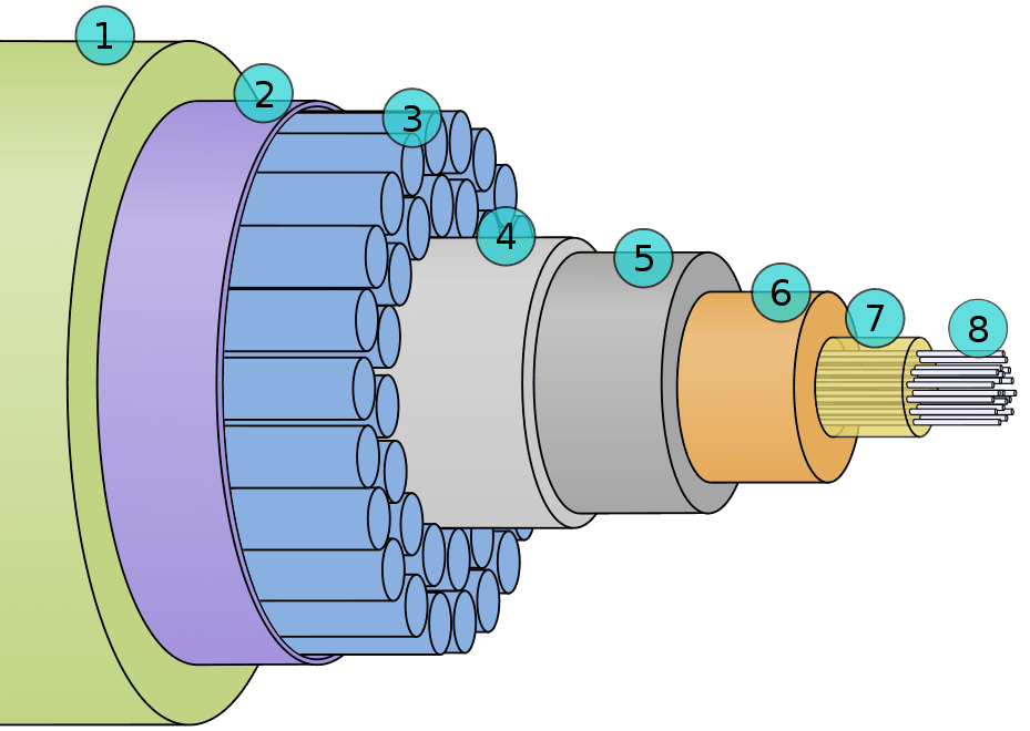 Skleněné jádro z mnoha vláken (8) je obaleno voskem (7) a vloženo do měděného vodiče (6). Ten je izolován polykarbonátem (5) a následuje další kovová vrstva (4), nejčastěji z hliníku, která zabraňuje vniknutí vody. Pro zpevnění je konstrukce obalena ocelovými lany (3) a opět zaizolována plastovou vrstvou, nejprve fólií Mylar z PET (polyethylentereftalátu) a konečně PE (polyethylenem), aby konstrukce odolala agresivní slané vodě. Celý kabel má v průměru zhruba 2,5 cm, drtivou většinu tvoří izolace. Na pobřeží, kde se kabel vynoří z vody, se kvůli eliminaci rizik používají i větší průměry.