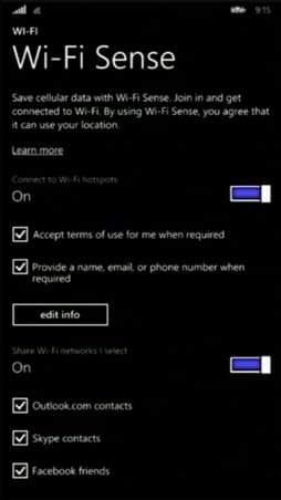 Balíček aplikací Sense obsahuje vylepšený Battery Power Sense, který jako na Androidu ukáže, kolik která aplikace žere baterie. Data Sense již známe – kontroluje spotřebu dat při připojení na internet, nový je ale Wi-Fi Sense. Díky této aplikaci můžete sdílet hesla k vašim Wi-Fi sítím se svými přáteli a ti se vás pak nemusejí při návštěvě ptát, jaké že to vlastně máte heslo na Wi-Fi.