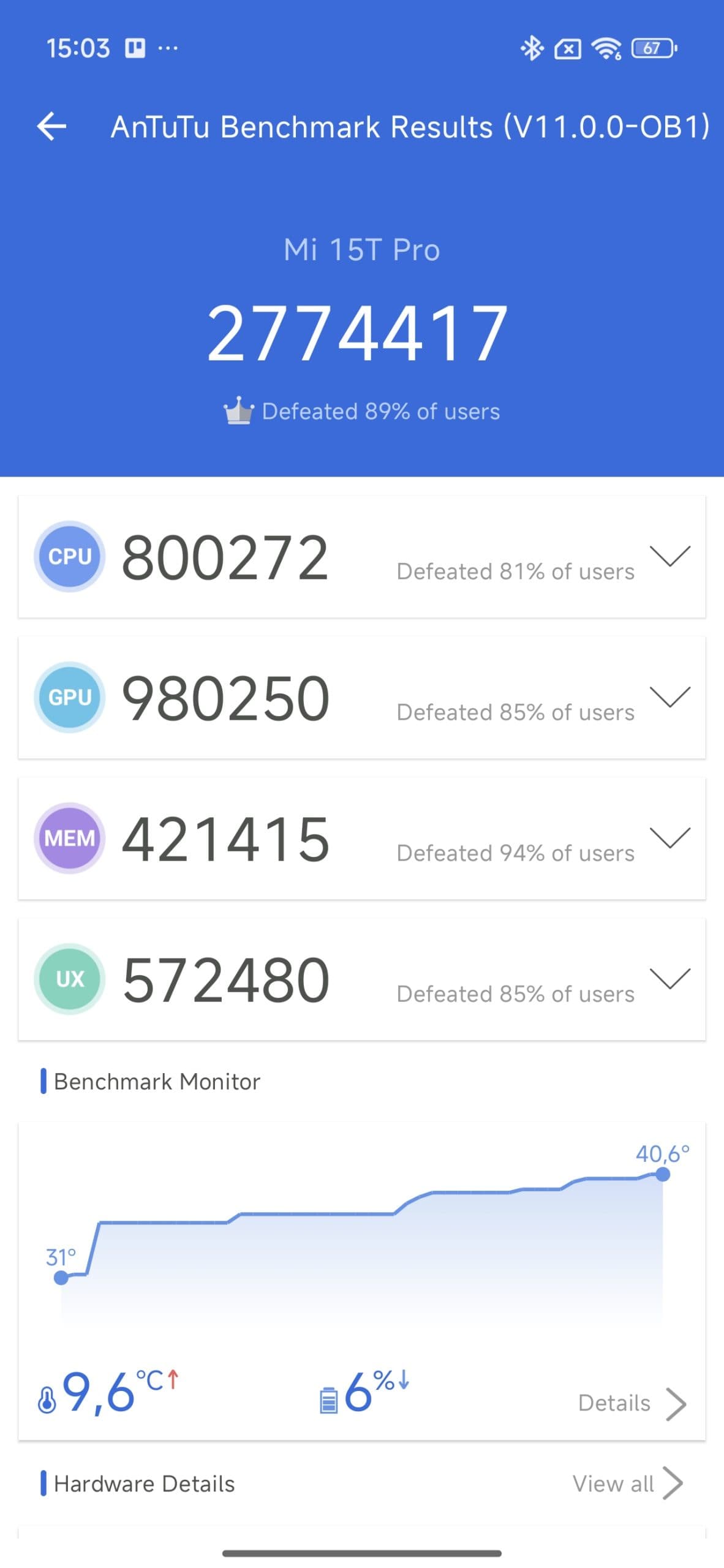 O chod zařízení se v případě Xiaomi 15T Pro stará čip MediaTek Dimensity 9400+ ve spolupráci s 12 GB RAM. Pokud vám ale ani takto bohatá paměť nestačí, můžete ji virtuálně rozšířit až o 12 GB. Celkový výkon je tak na velmi vysoké úrovni a například testu Antutu benchmark odnesl skvělých 2 774 417 bodů.