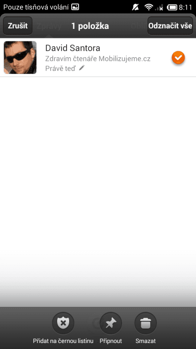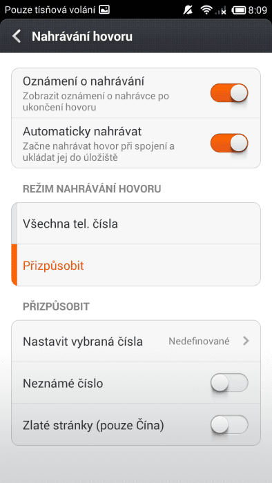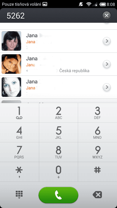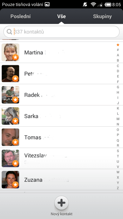 První věc, která mě zaujala, byla možnost nechat si seznam kontaktů zobrazit v tzv. jednoduchém režimu. Hongmi poté přestane zobrazovat fotografie kontaktů a jsou viditelná pouze vypsaná jména. Subjektivně mi poté práce se seznamem přišla o něco rychlejší. Celý telefonní seznam je horizontálně posuvný, mezi posledními použitými kontakty, klasickým seznamem a skupinami. Velkou výhodou Hongmi a jeho MIUI 5.0 je též zobrazení oblíbených kontaktů v telefonním seznamu před klasickým abecedním řazením ostatních kontaktů. Nemusíte nikam přepínat, prostě máte oblíbené kontakty hned na začátku seznamu. Zvuk během hovoru je příjemný, žádná plechařina.