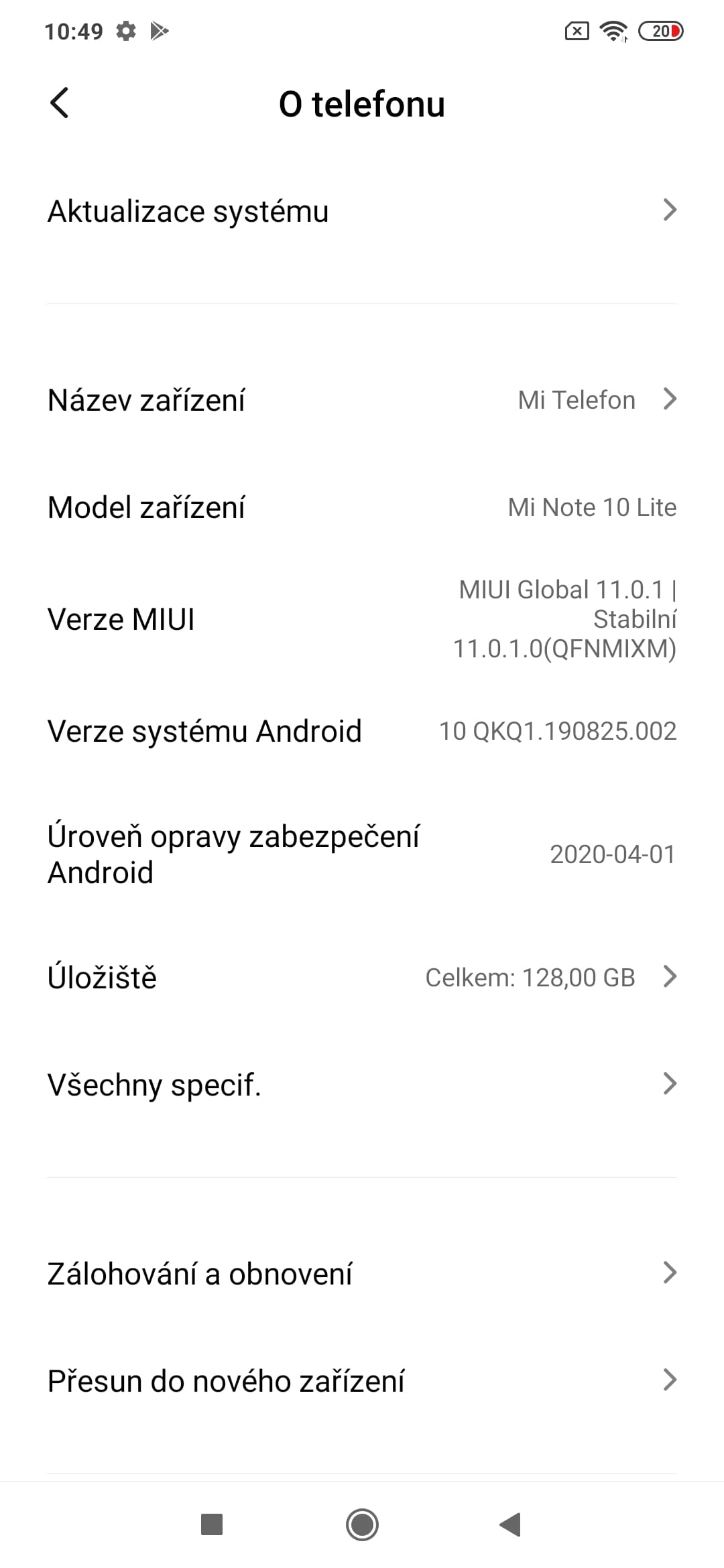 V Note 10 Lite běží kdesi hluboko Android 10, hluboko pohřbený pod nástavbou MIUI Global v 11. iteraci. Pokud jí věnujete čas a pozornost, objevíte tmavý režim, sdílení souborů přes Mi Share, podporu pro bezdrátový displej, filtr modrého světla, tři způsoby skrývání notche, úpravy názvu operátora, spořič baterie, automatické vypnutí a zapnutí, rodičovskou kontrolu nebo Game Turbo pro optimalizaci výkonu ve hrách.