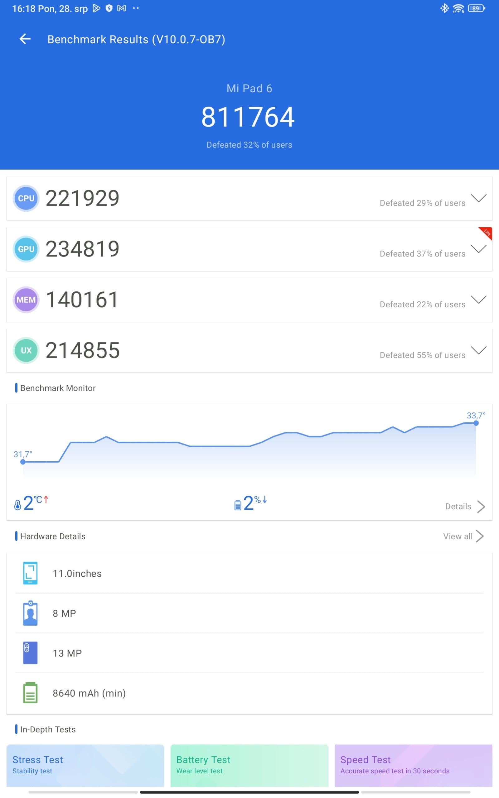 A hry si tu zahrajete opravdu všechny a na ty největší detaily. Nerušený herní zážitek prožijete u náročných titulů jako je NFS, Fortnite a mnoho dalších. Skvělý výkon podporuje i populární Antutu benchmark, kde si tablet vysloužil skóre činící 811 764 bodů.