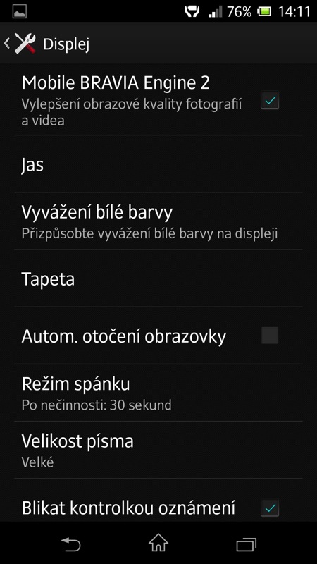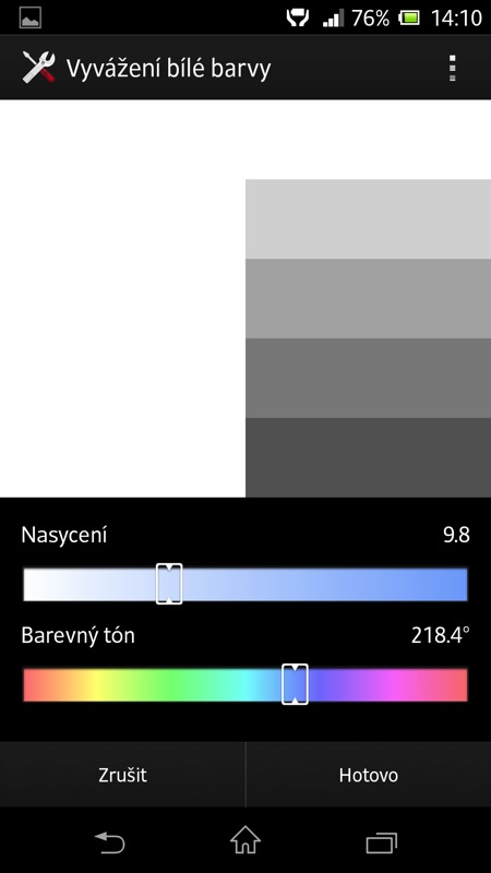 V celém prostředí je nyní u některých prvků černá barva skutečně černá, nejde jen o tmavě šedivou, což působilo dojmem, jako kdyby byl displej Xperie Z horších kvalit než např. AMOLED displeje. Jistě, že AMOLED displeje stále produkují lepší černou barvu, ale bez přímého srovnání je to již prakticky nepostřehnutelné. Dále výrobce přidal možnost vyvážení bílé barvy displeje – nastavit si můžete nasycení a barevný tón. Díky tomuto si každý majitel Xperie Z může nyní vyladit displej podle svého gusta.