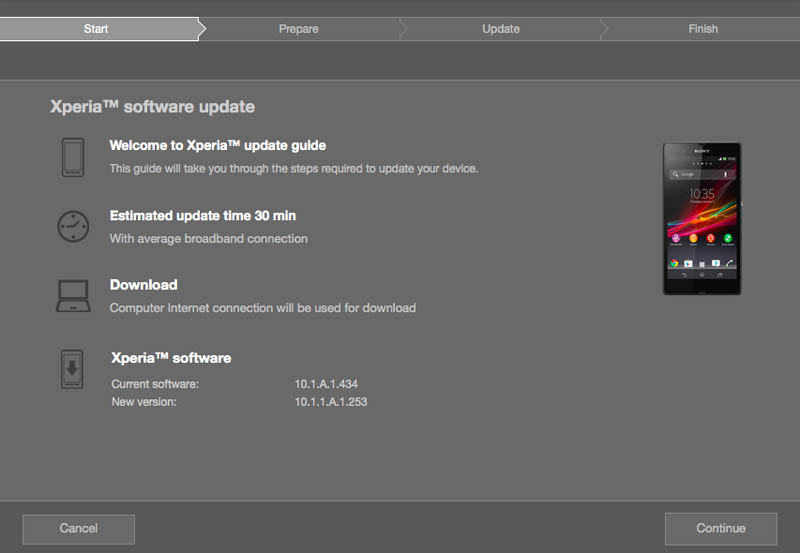 Aktualizace na nejnovější verzi firmwaru s označením 10.1.A.1.253 je pro majitele smartphonu Sony Xperia Z dostupná skrze program PC Companion (na Windows) a Sony Bridge for Mac (na Mac OS X). Pomocí OTA aktualizace (česky vzduchem, z anglického „Over The Air“) nám telefon aktualizovat na tuto verzi nedovolil. Před zahájením aktualizace se doporučuje mít telefon co nejvíce nabitý, aby během aktualizačního procesu nedošlo k jeho vypnutí a přerušení celého procesu.