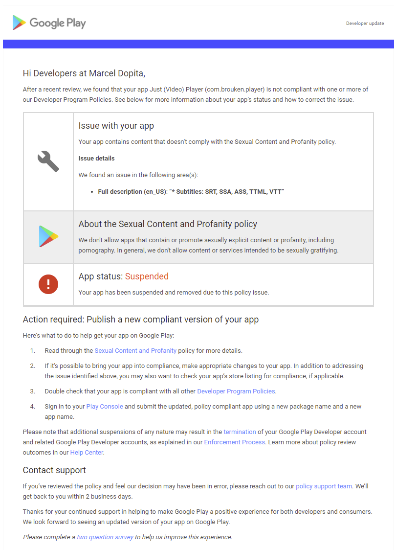 Vývojář Marcel Dopita obdržel od Googlu automatický e-mail s vyjádřením, že jeho aplikace disponuje obsahem nevyhovujícím zásadám společnosti týkající se sexuálního obsahu a vulgárních výrazů. Výsledkem byla suspendace přehrávače, která ale netrvala nijak dlouho. Kolikrát se stane, že aplikace je pozastavena na celé dny, no tentokrát to bylo jen na pár hodin a Just (Video) Player je opět volně ke stažení.